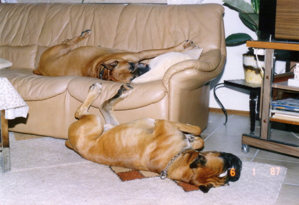 Im Urlaub standen regelmäßig Wanderungen im Karwendel und Rofangebirge auf dem Plan. Sascha’s Pfotenabdruck kann man in vielen Gipfelbüchern finden. Nachdem wir dann in ein größeres Haus umgezogen sind, kam zu Sascha der mittlerweile schon 11 Jahre alt war, im Jahr 1985 noch Boxer Eddi vom Kniebis (nun inzwischen nicht mehr ahnungslos, also mit VDH-Papiere !) hinzu. Er hat für Sascha noch zwei Jahre Schwung ins Alter gebracht. Sascha wurde über 13 Jahre alt. Leider konnte nicht wie geplant, der Stab für den Hundesport an Eddi übergeben werden, da dieser neben HD und Spondylose auch noch Herzprobleme hatte. Eddi durfte so lange bei uns ein geliebter Hund sein, bis sein dann zu großes gewordenes Herz den Körper nicht mehr versorgen konnte. Eddi war ein super veranlagter Hund, leider war sein Leben von nicht ganz 4 Jahren viel zu kurz. Es tat weh, so einen jungen Hund gehen lassen zu müssen.